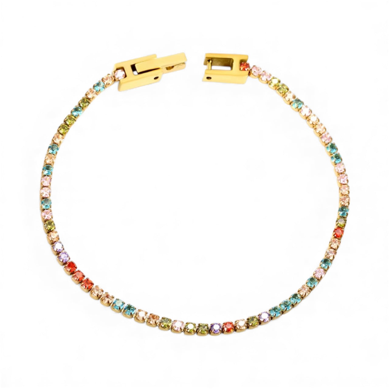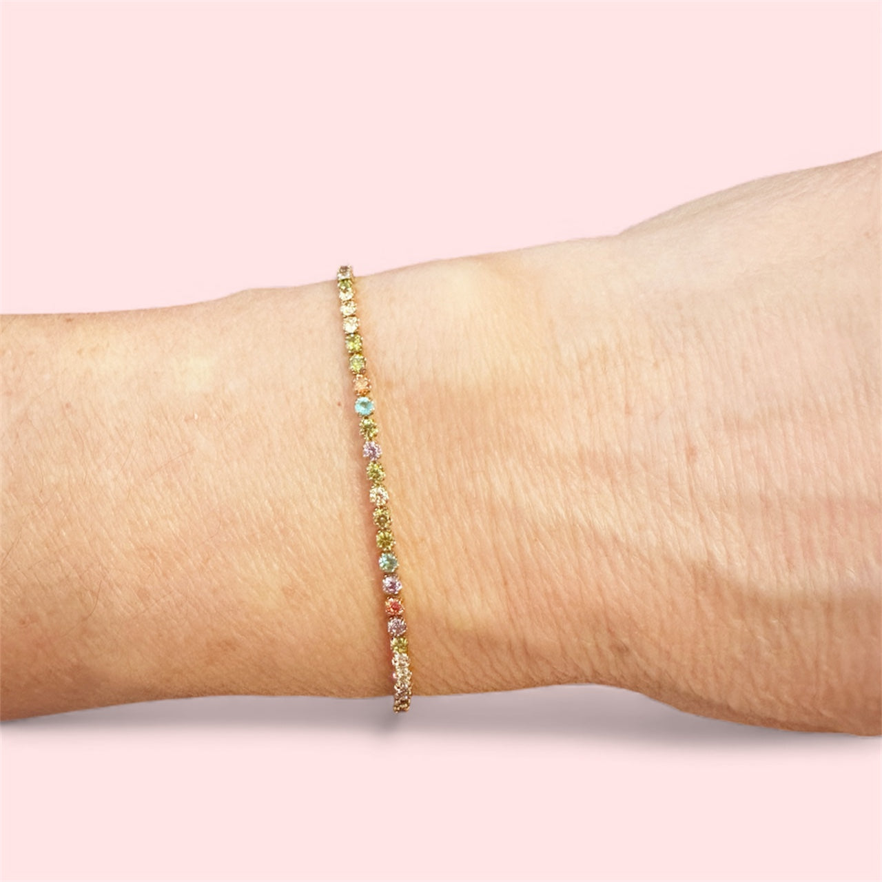 Meet Confetti, our rainbow-bright tennis bracelet that adds instant fun to any stack. Featuring vibrant 2mm stones set in a sleek gold finish, this piece brings the perfect pop of color without ever feeling loud. Lightweight, non-tarnish, and effortlessly chic, Confetti is your new go to for everyday sparkle.