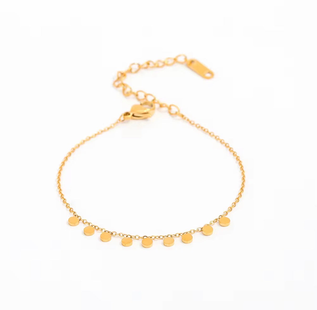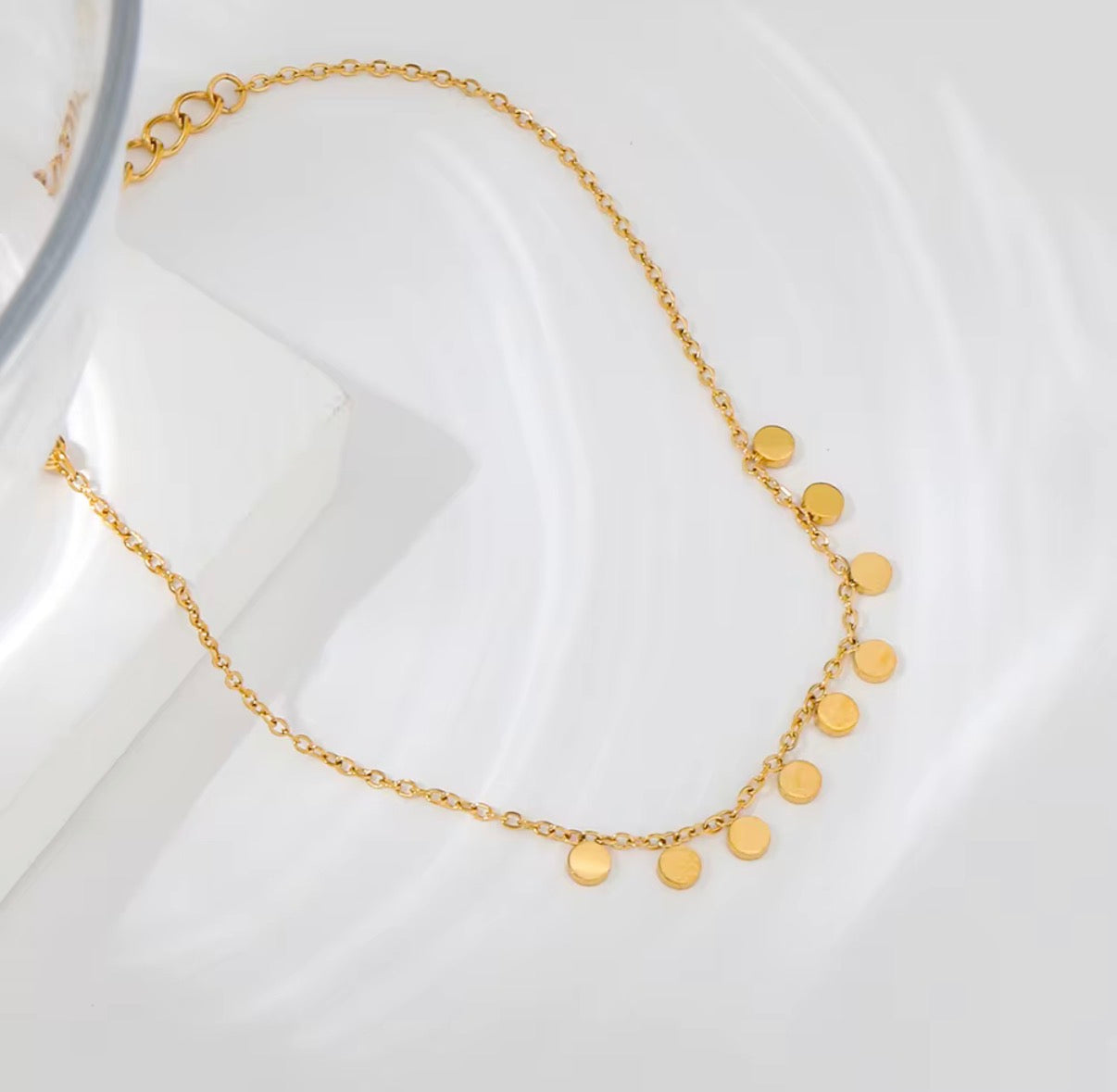 This dainty gold necklace features tiny 3mm discs that move with you, sparkling at every turn. Effortlessly fun, flirty, and full of boho-chic energy, it’s the little piece that adds instant personality to jeans, tees, or a night-out look.