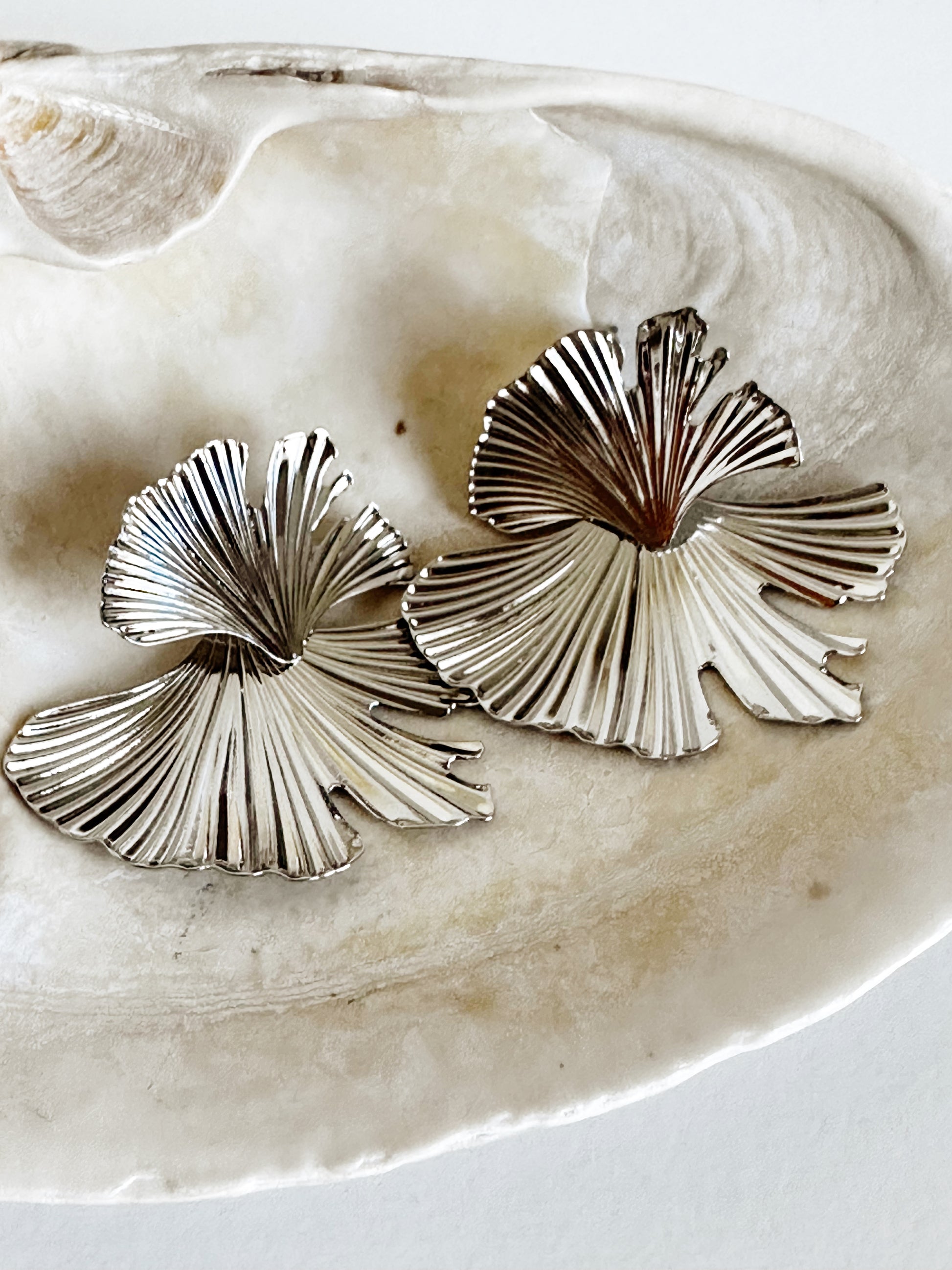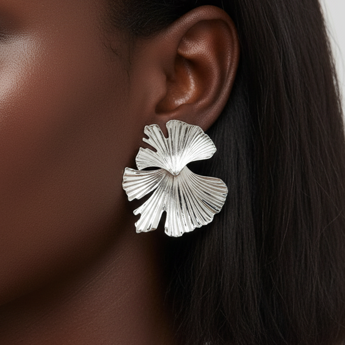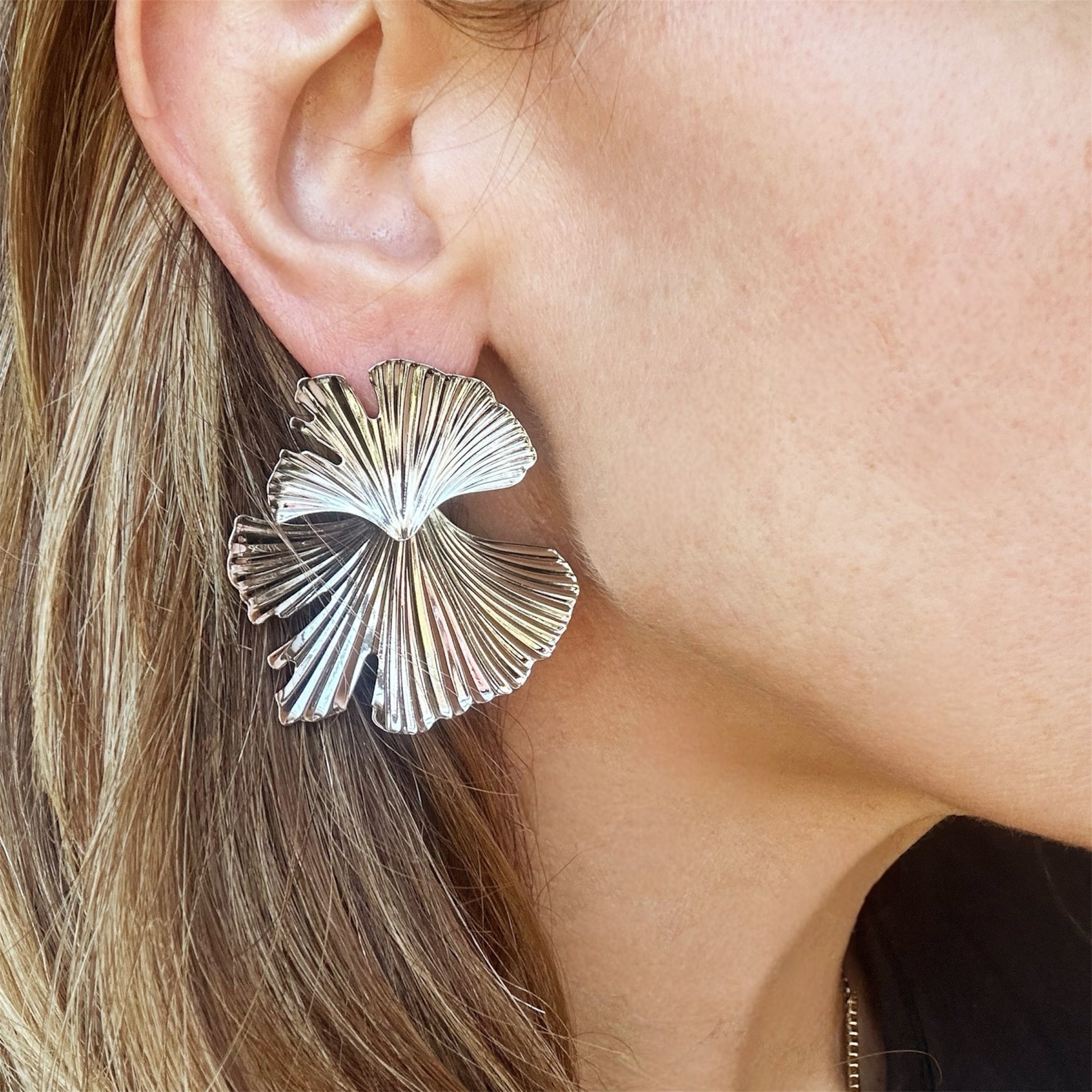 Crafted in a high-shine silver finish, this statement earring captures the graceful curves of a lotus petal with a modern, dimensional twist.