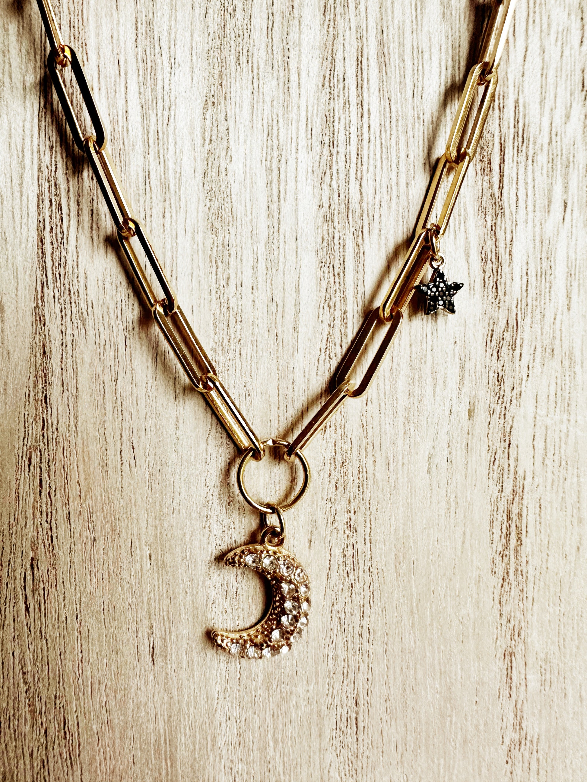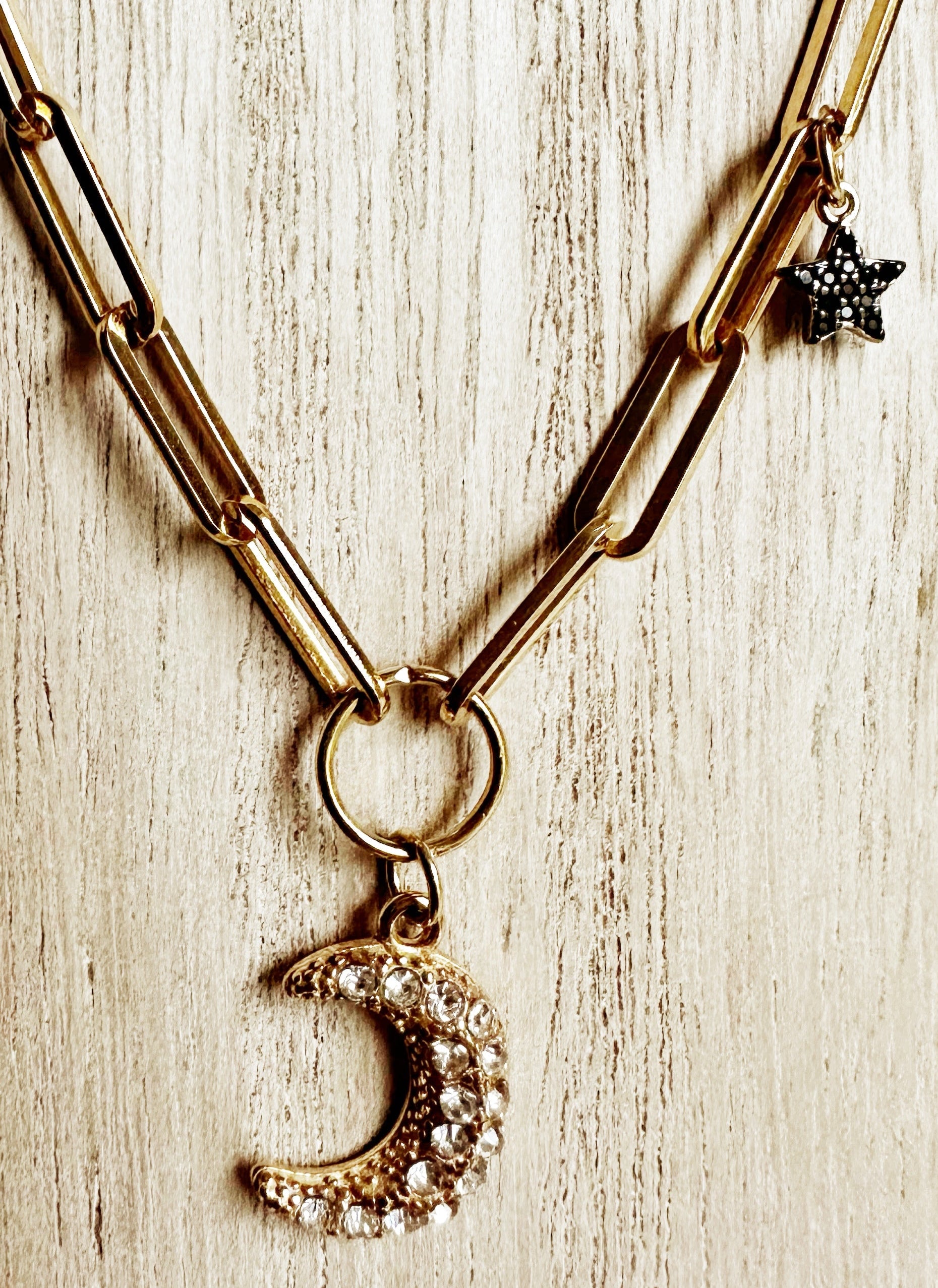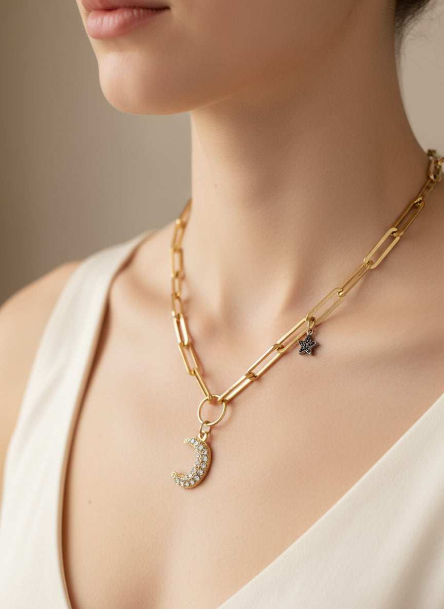 Radiate elegance and light with Celeste. A gold link chain adorned with a sparkling moon and star, the perfect mix of bold and feminine energy.